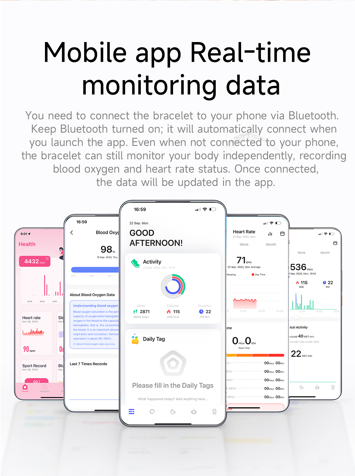 Equipped with the high-precision HX3918H heart rate sensor, the B6 supports 24-hour continuous heart rate monitoring, real-time blood oxygen tracking, hourly HRV assessment, and real-time stress analysis, capturing vital body signals to help you adjust your state promptly. Scientific sleep tracking records duration and light/deep sleep stages, offering personalized recommendations; multiple sports modes accurately log steps, calories, and more to support light workouts and health management. Bluetooth 5.2 ensures stable connectivity, syncing data to your app for efficient health tracking.