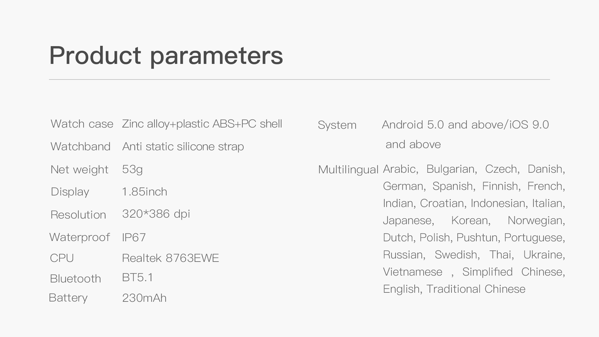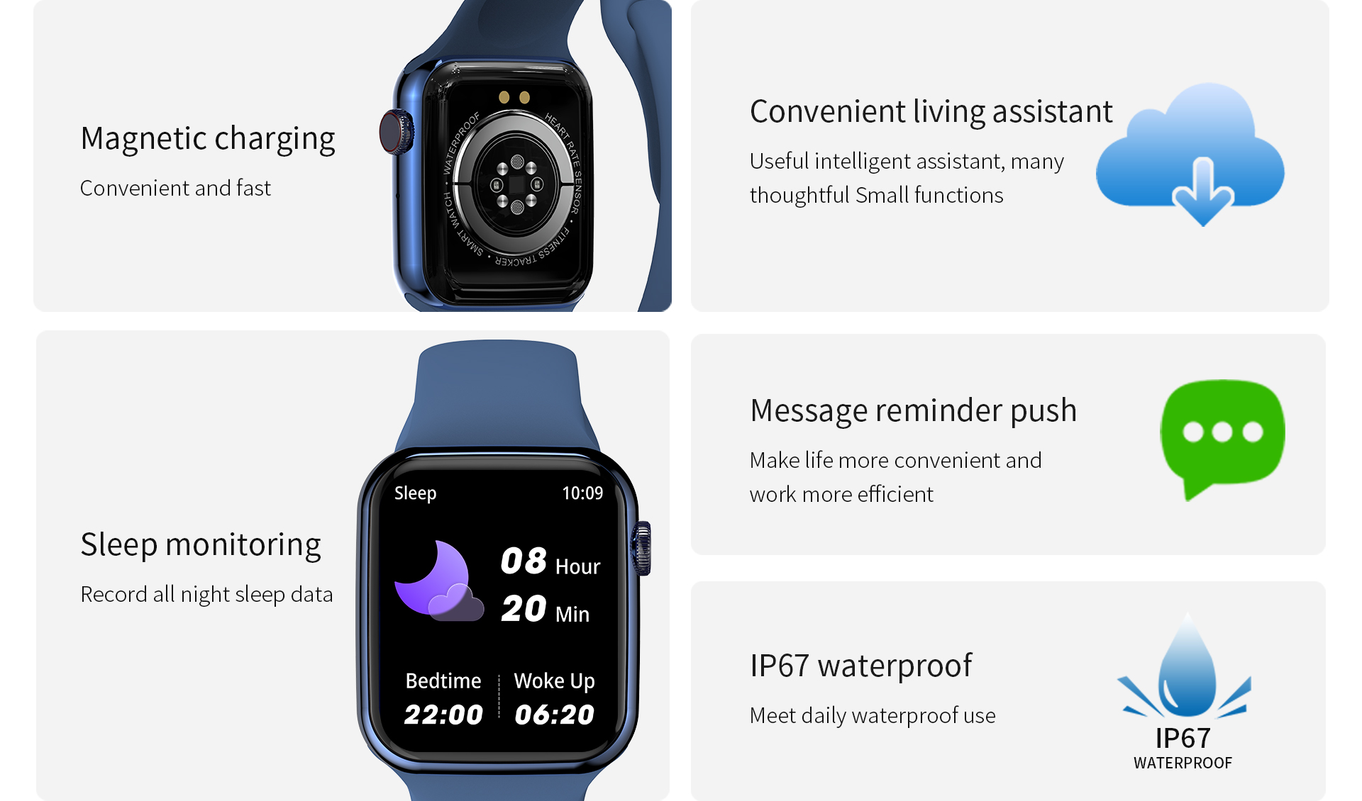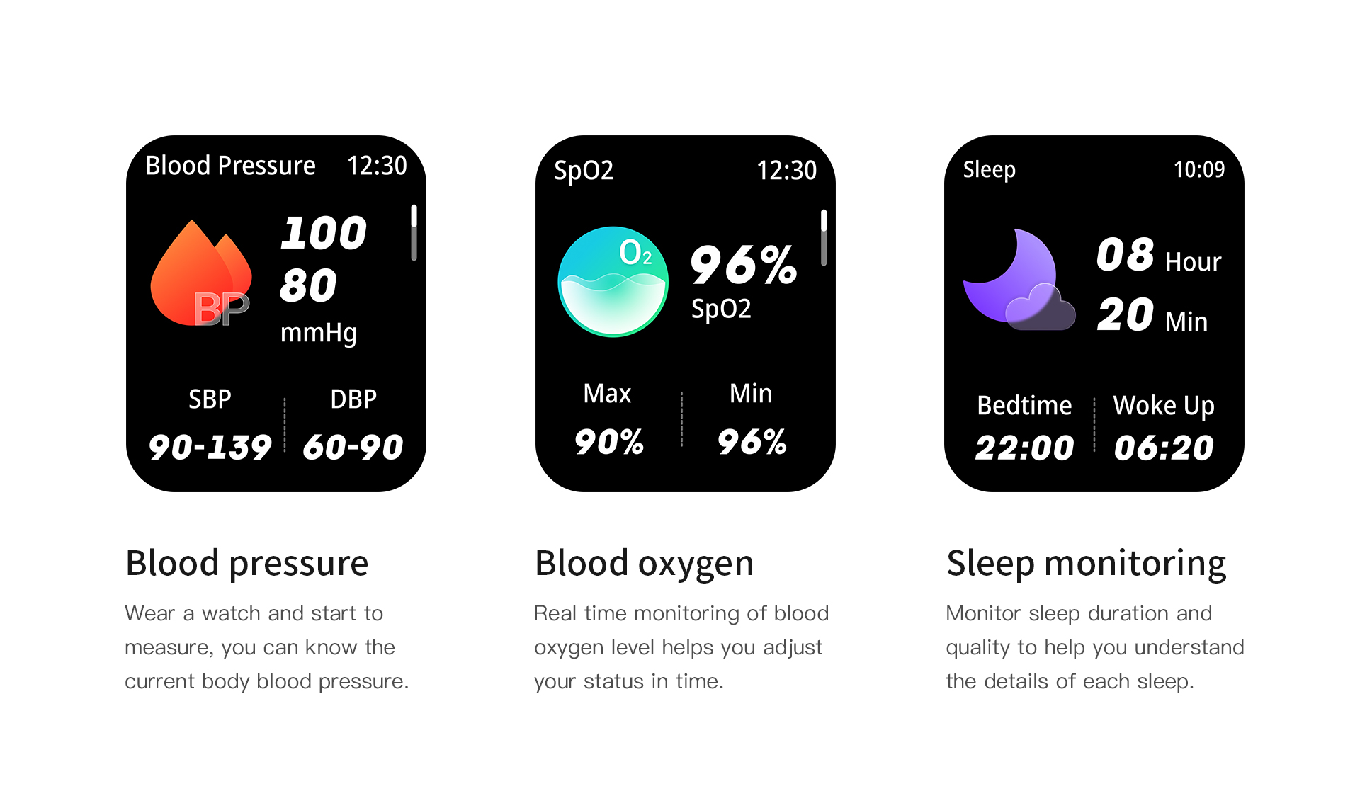 【Know Your Sleep】Not only precise monitor of sleep overnight,but also detect a siesta.With a full record of sleep,analyse the sleep quality,sleep duration,sleep depth.【Intelligent Message Reminder】Never miss any important news!SMS,APP message push,etc.The watch will synchronously remind you that you don't need to check on the phone.Note: Can't reply message.