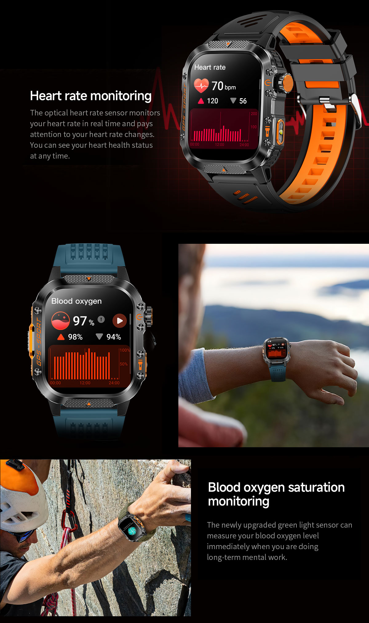 The G30 is equipped with a professional GPS satellite navigation system, accurately recording movement tracks and maintaining stable signal even in dense urban areas. The built-in altimeter/barometer and electronic compass provide real-time orientation and altitude data, offering reliable navigation guarantees for mountaineering, hiking and other outdoor activities. The built-in flashlight makes night adventures safer, keeping you oriented in the wilderness for boundless exploration.