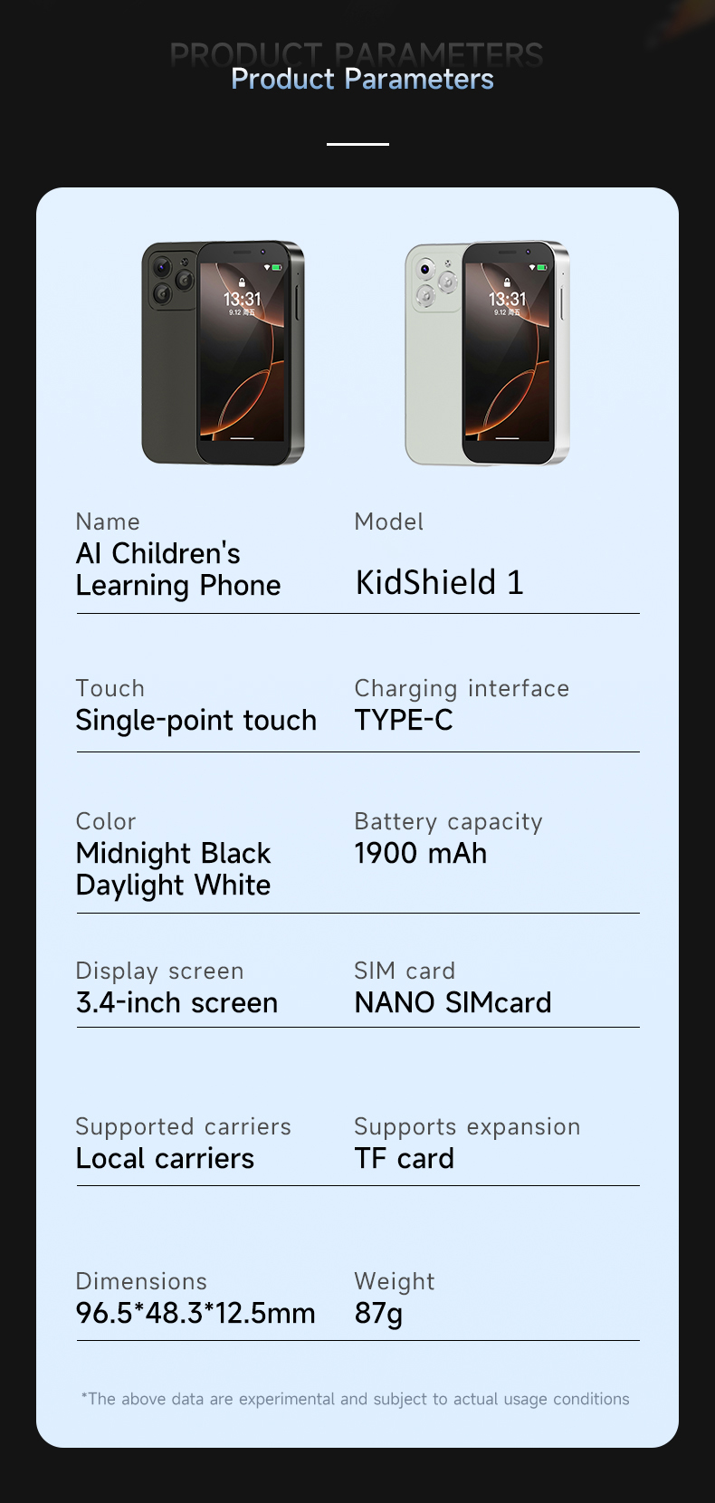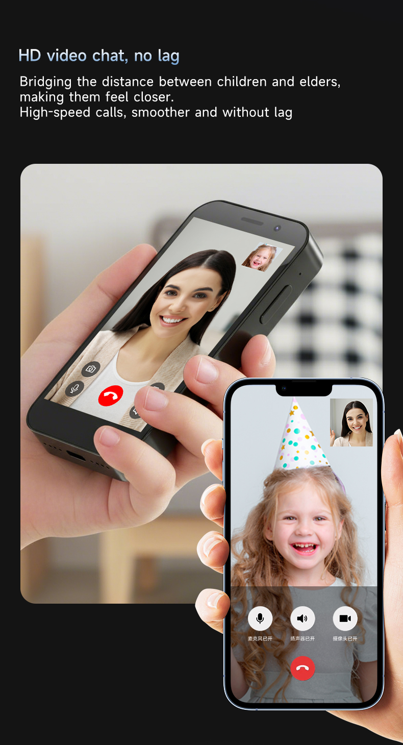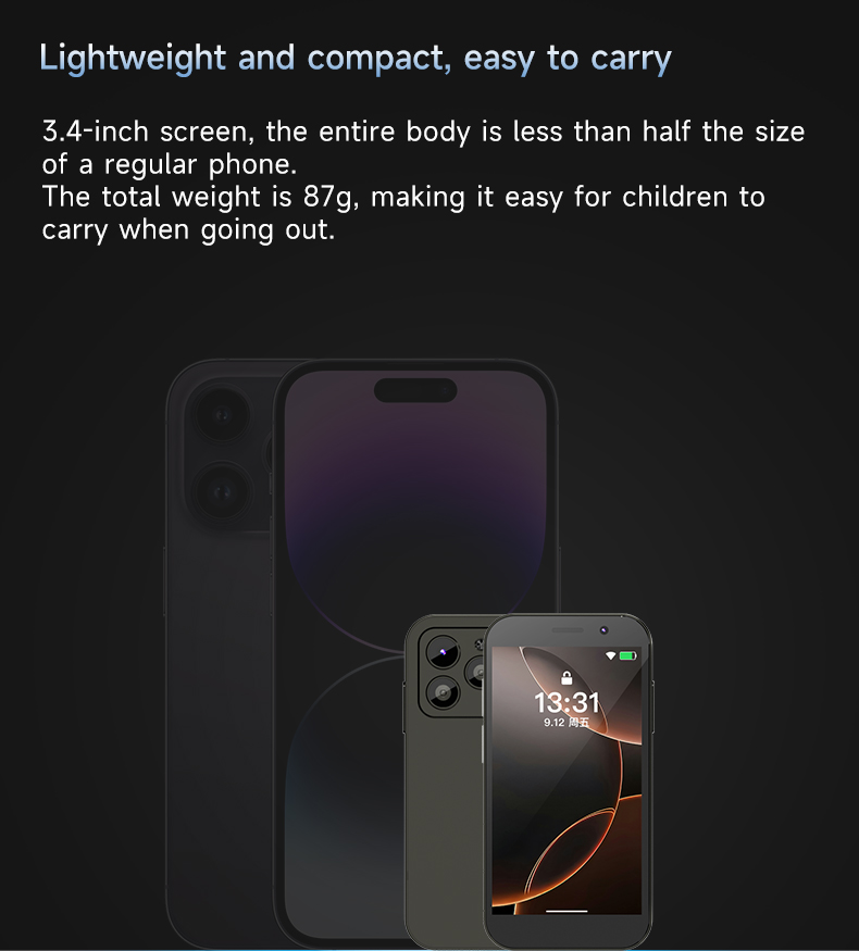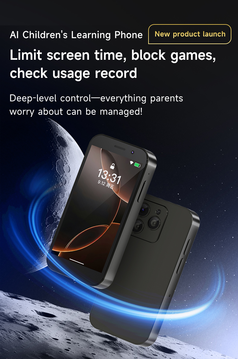 The AI Kids Phone features an ultra-slim body measuring just 96.5 × 48.3 × 12.5 MM and weighs only 87g (single handset). Its ergonomic design offers a comfortable grip for kids, while the slim profile ensures easy portability and prevents fatigue during extended use.