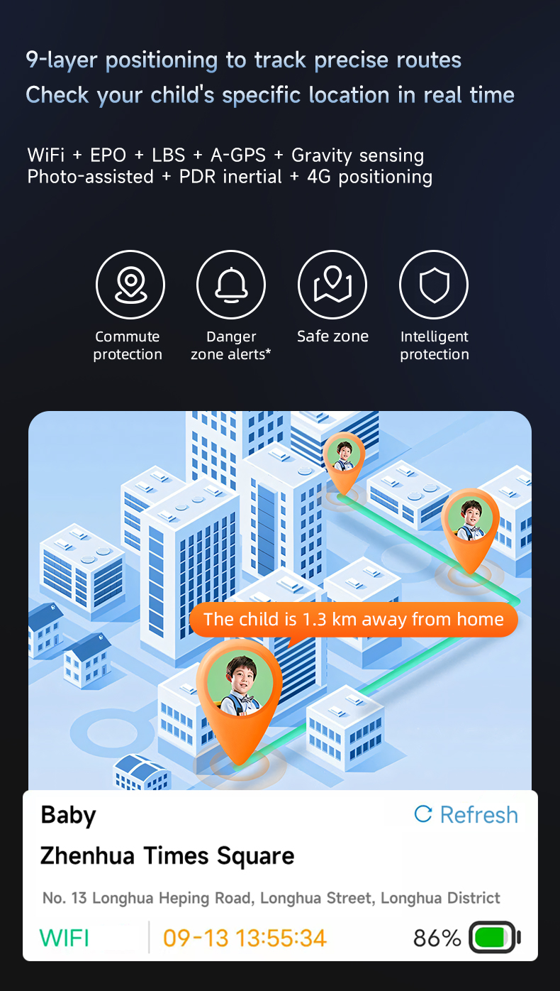 With FPC 4G antenna plus WIFI+BT+GPS triple integration, it offers precise positioning and location tracking. Parents can view real-time location and historical tracks via the dedicated app, ensuring kids' safety at all times.