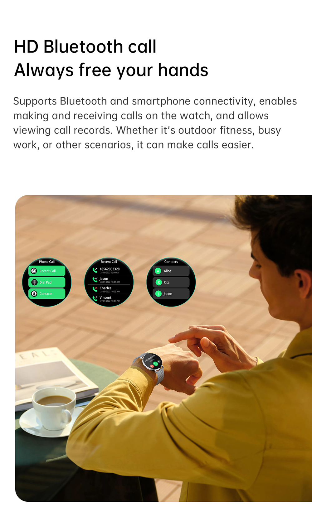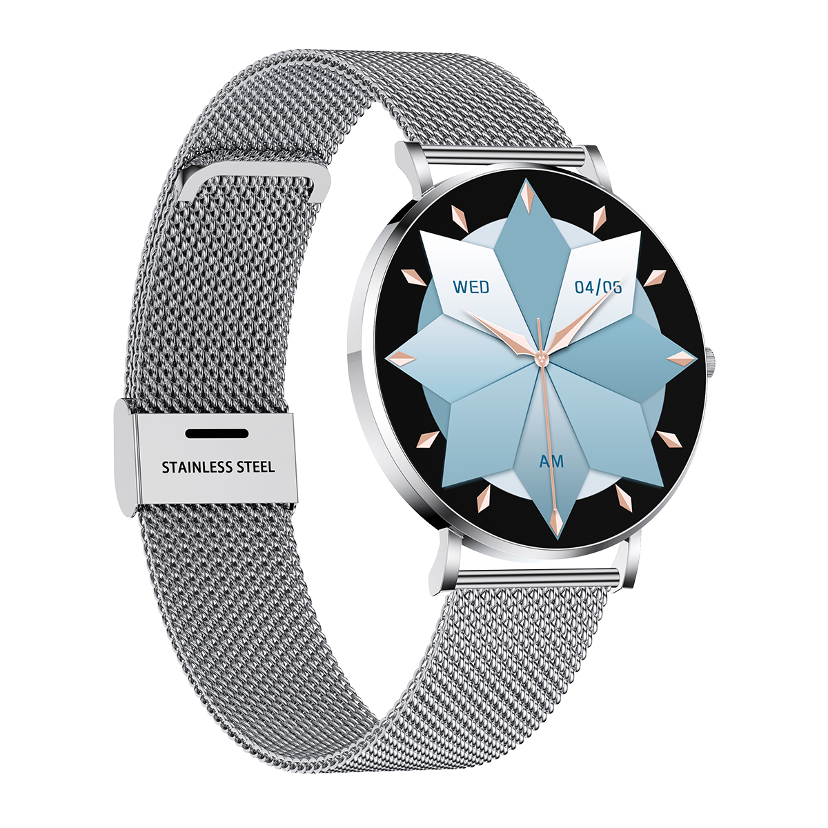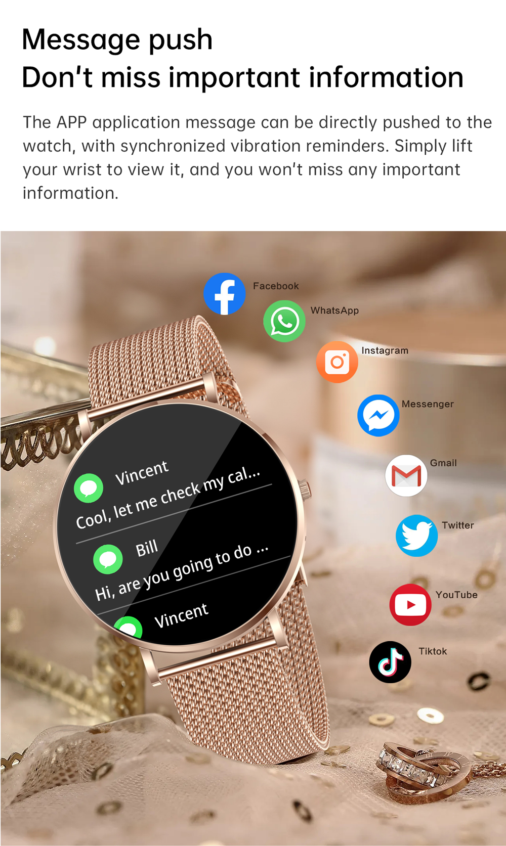 Dial & Call: Built-in microphone and speakers; Smart watch with receive/dial calls and voice assistant. At the same time, the smart watch for women synchronizes information notifications, such as SMS, Facebook, WhatsApp, Instagram, Twitter, Telegram, LinkedIn and other message pushes; This smartwatch vibrates and notifies you. Watch menu languages support English, Spanish, German, French, Italian, etc