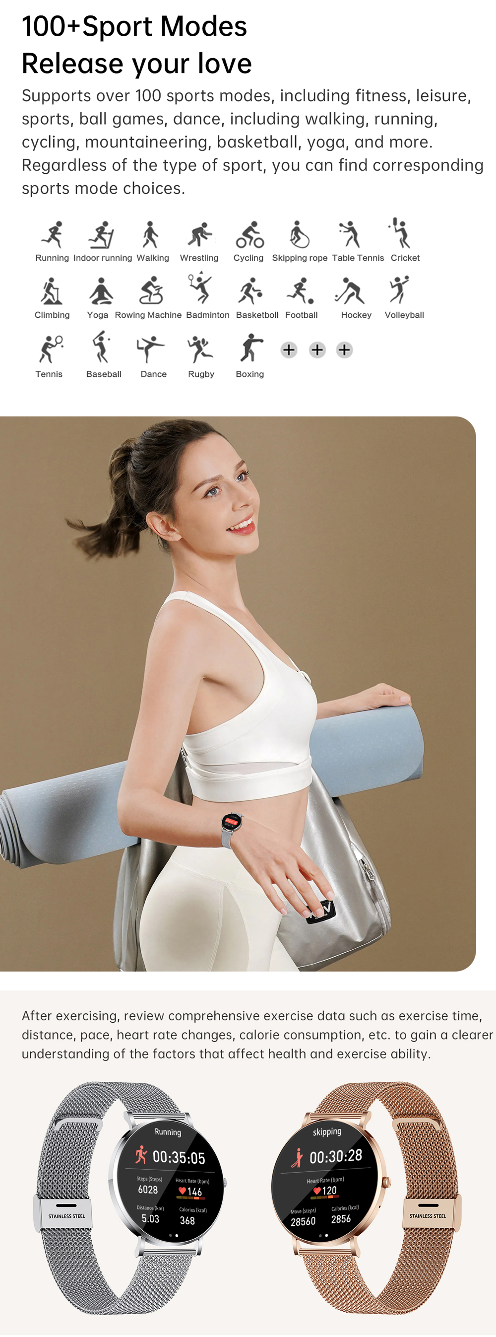Multisport Tracker: Fitness watches for women sports record steps, calories, distance. The sport watch has 100+ built-in sports modes; Sport mode includes walking, running, hiking, cycling, basketball, badminton, football, tennis, etc. You can select the sports item on the pedometer watch for monitoring and tracking. Sport watches for women is IP67 waterproof, dustproof and sweatproof, the strap is soft and comfortable to wear. Also built-in stopwatch and timer. Make exercise more convenient