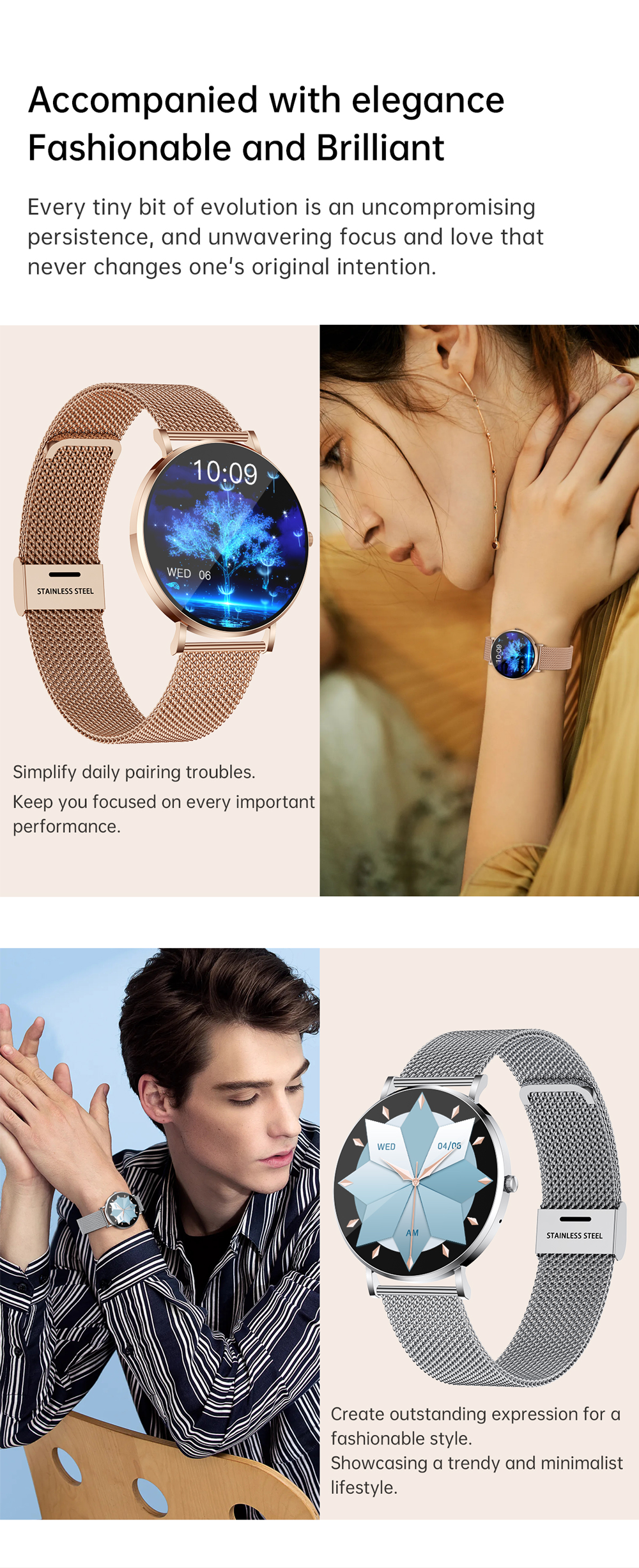 Amoled round touch screen: 1.43" HD resolution large-screen watch, Amoled material screen is smoother to touch and more comfortable to visualize, and the screen is scratch-resistant. Rich watch face, you can easily change the style, and support uploading photos to customize the screen watch face. This women's watch comes with two straps, one in steel and one in silicone. Smart watches for women is suitable for a variety of occasions to wear, leisure, outdoor, home, office are applicable