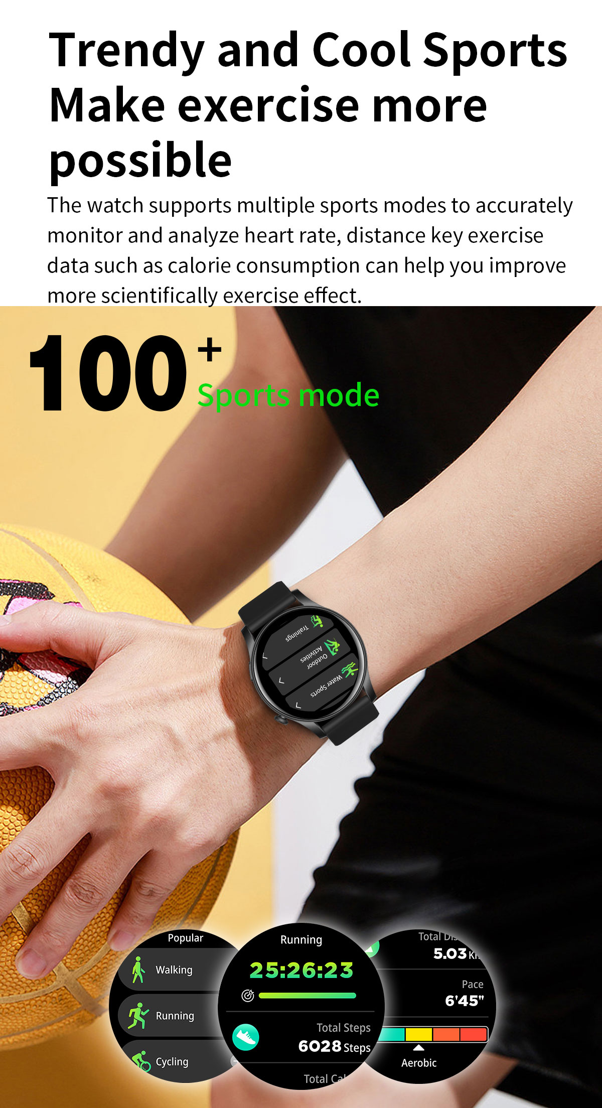 *100 Plus Sports Modes* The watch supports 123 sports modes such indoor running, walking, rope skipping, swimming, cycling mountaineering and other sports modes.Calculate your exercise time, calories burned, heart rate, etcto keep you motivated, or keep trying, and see how youare how you have performed recently.