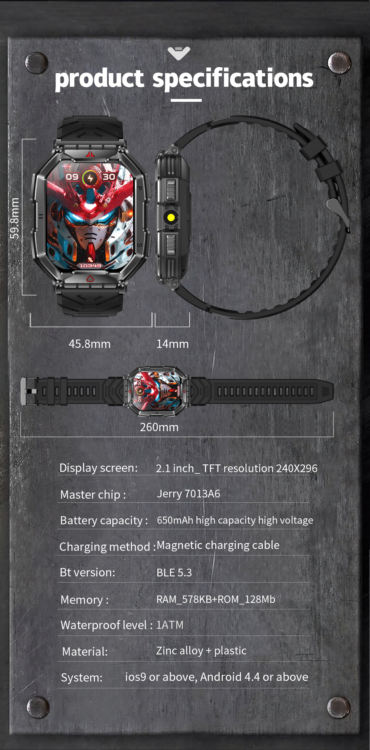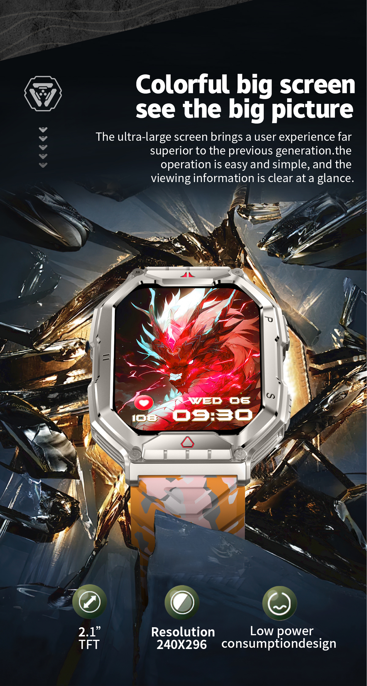【Multifunctional Long Battery Life Smartwatch】- men's tactical smartwatch also offers many useful functions such as a calculator function, weather forecast, music player, alarm clock, and more. It also features a wrist lift to light up the screen, call alert, SMS alert, alarm reminder, shake to take a photo, phone search, and more. In addition, the smartwatch has a built-in 650mAh battery, which can be fully charged in 2 hours, can be used for up to 7-14 days, and has a long standby time of about 60 days.