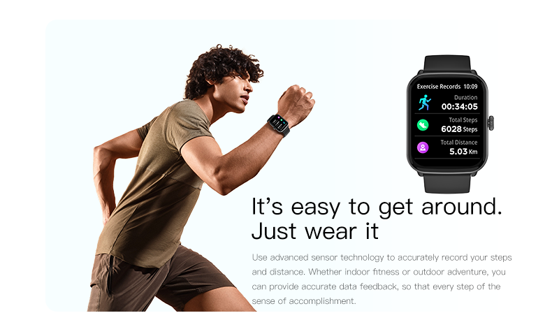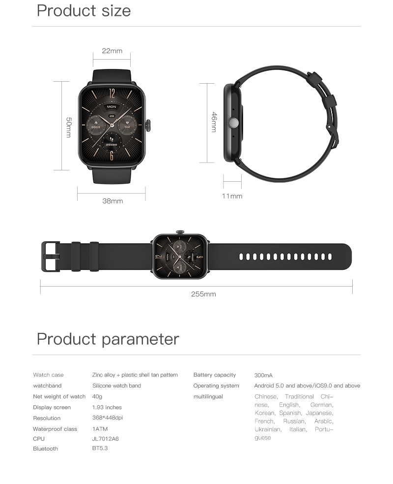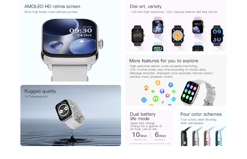 Crafted with a zinc alloy middle frame, textured plastic bottom case, and skin-friendly silicone strap, it offers a delicate feel and comfortable wear. The 1.93-inch fully laminated AMOLED touchscreen, with a 368*448 high-definition resolution, delivers clear and detailed visuals, making time and sports data easy to read at a glance. Its slim body fits comfortably on the wrist, with a minimalist design that complements any outfit for all-day wear.