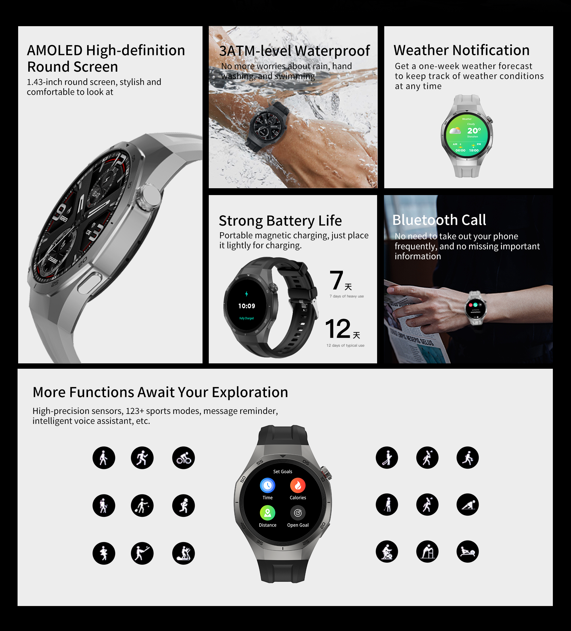 Featuring a 1.43-inch AMOLED high-definition round screen with a 466*466 high resolution, it delivers crisp and clear visuals, making sports data and time easy to read at a glance. The plastic spray-painted case paired with a skin-friendly silicone strap is durable and comfortable to wear. The 3ATM water resistance rating stands up to rain, hand washing, and swimming, easily handling outdoor and daily scenarios. Bluetooth 5.2 ensures stable connectivity, and the Bluetooth calling feature lets you stay connected without taking out your phone, so you never miss important updates.