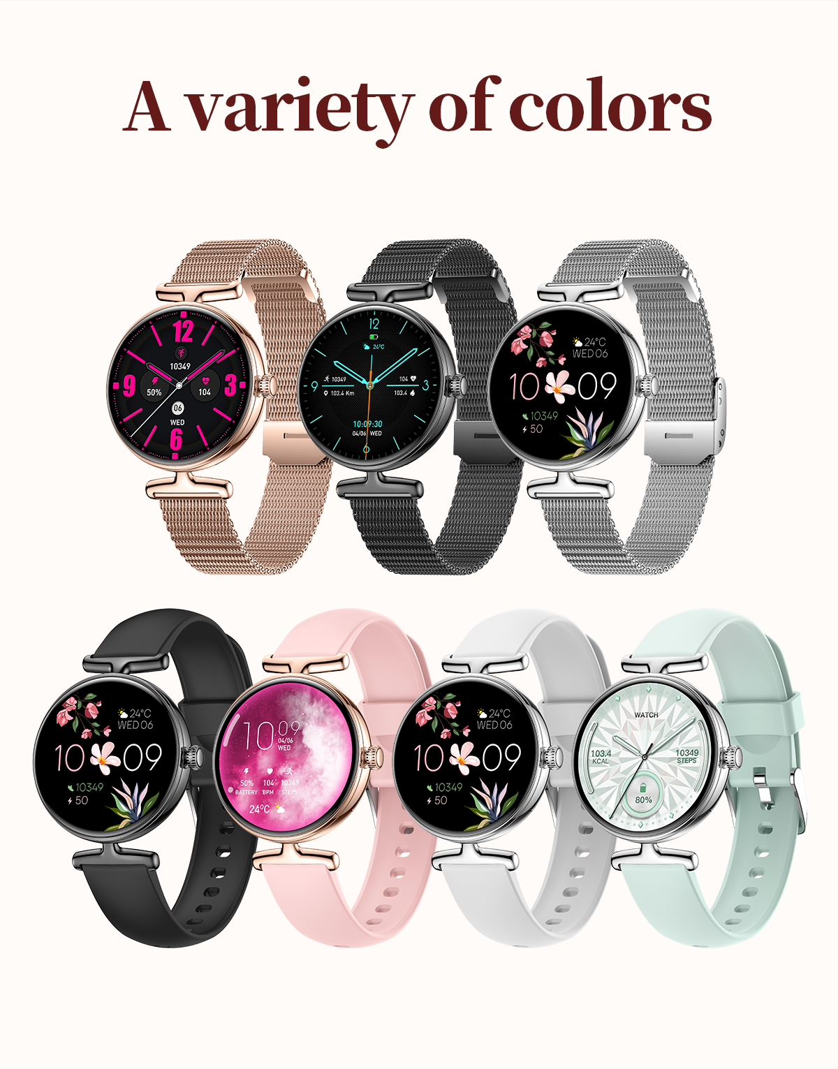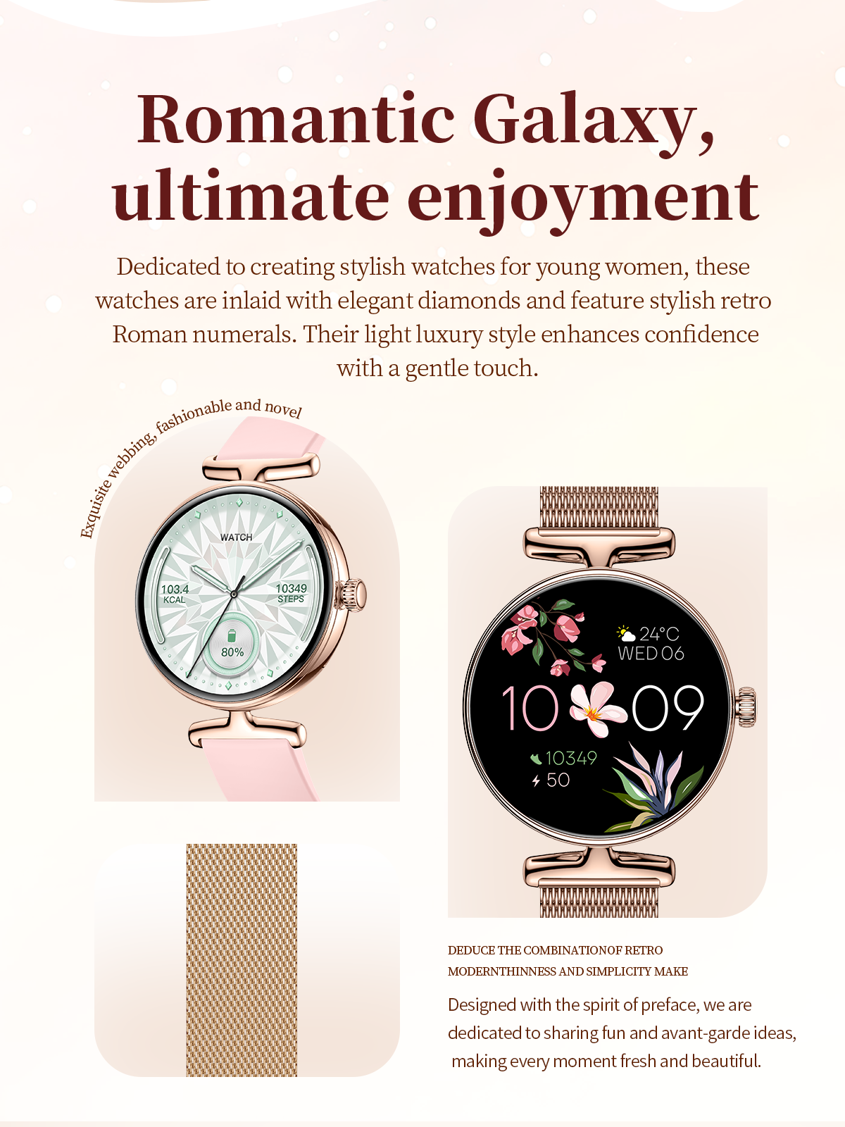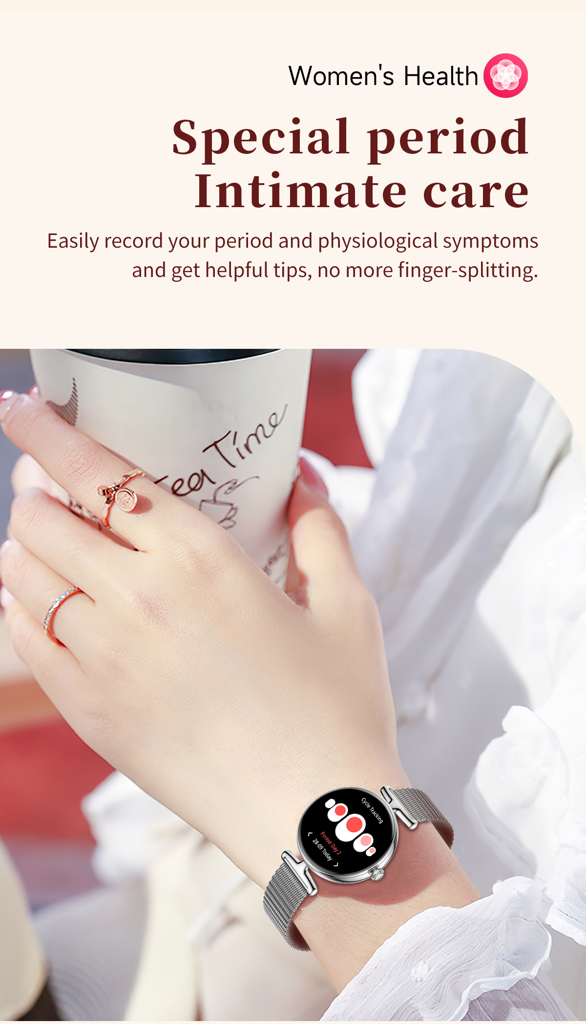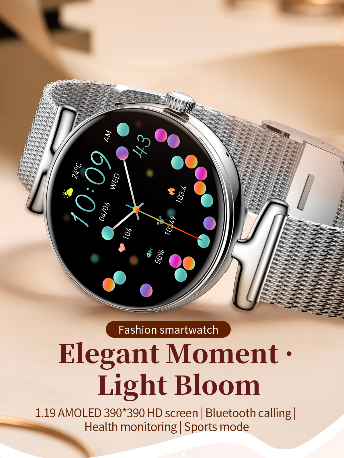 The SW41 features a 1.19-inch AMOLED high-definition full screen, with a 390×390 resolution and 99.5% Adobe RGB wide color gamut, delivering vibrant and delicate colors like a polished gemstone. Its slim and lightweight body fits the contours of a woman's wrist for comfortable, almost weightless wear. The full-metal case, paired with an exquisite rotating crown, ensures smooth and tactile operation, while multiple exquisite dials can be switched freely to match your unique style, making every wrist lift exude elegance.