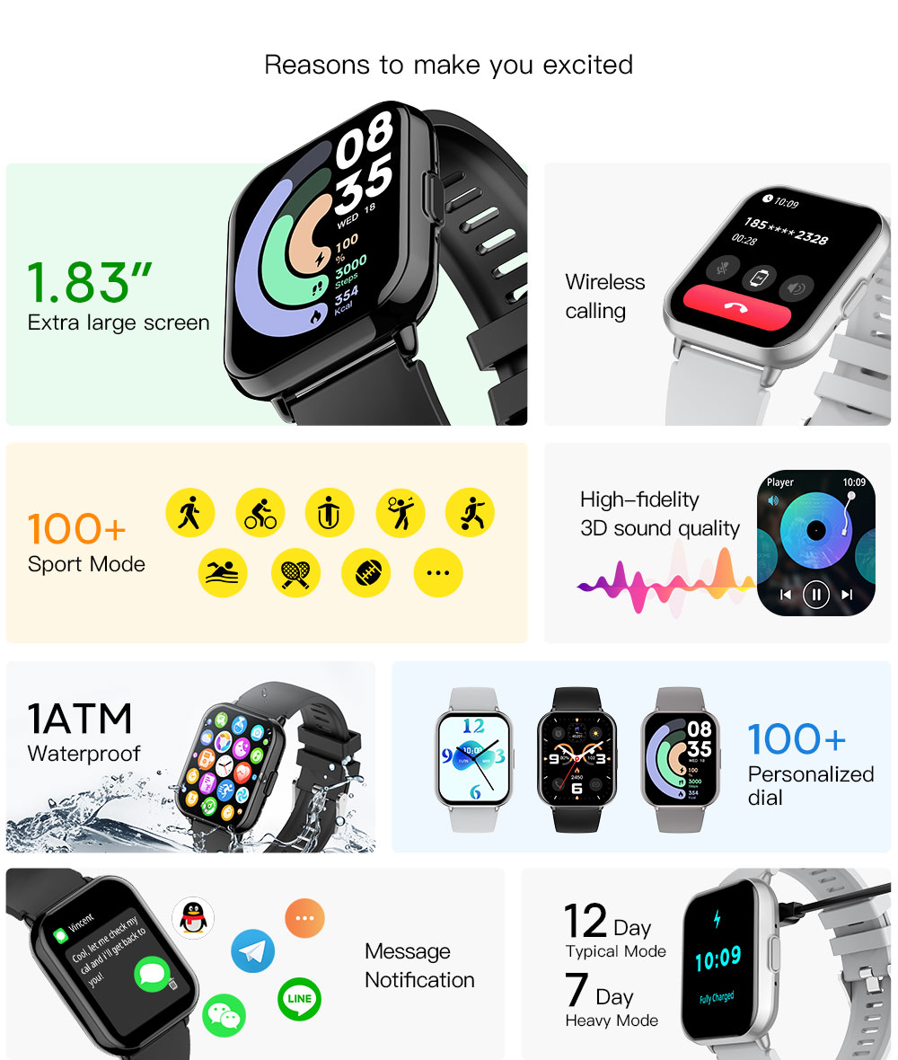 Smartwatch with bigger size screen, 1.83inch TFT full touch colorful screen bring comfortable touch and excellent visual experience. 5 menu styles available, support split-screen browser help you quick access to common functions. 100+ different watch dials for your pick in the App, you can also customize it with your loved photos.