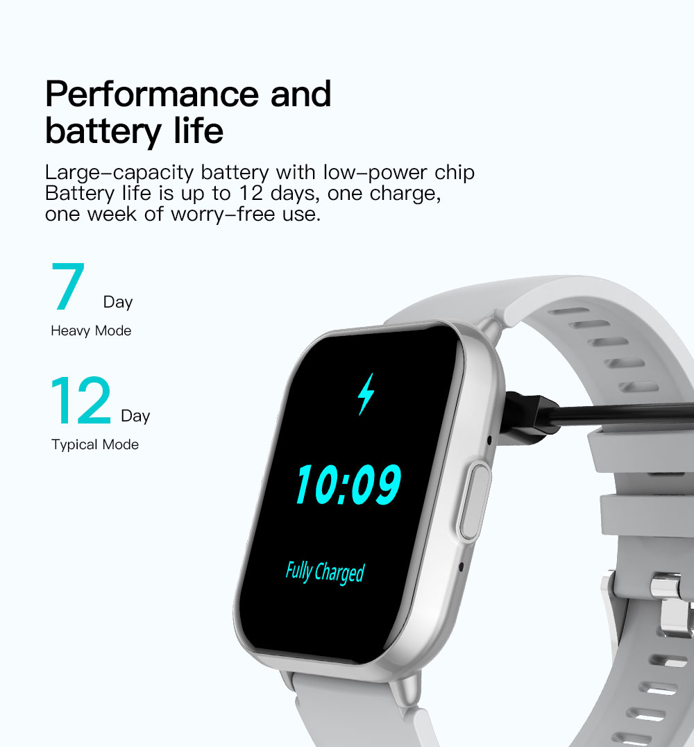 Smart watch for Android iOS phones compatible. IP67 waterproof free from daily splashes and exercise sweat. Battery can be fully charged in about 2 hours, and be used for 3-5 days, up to 25 days standby time.