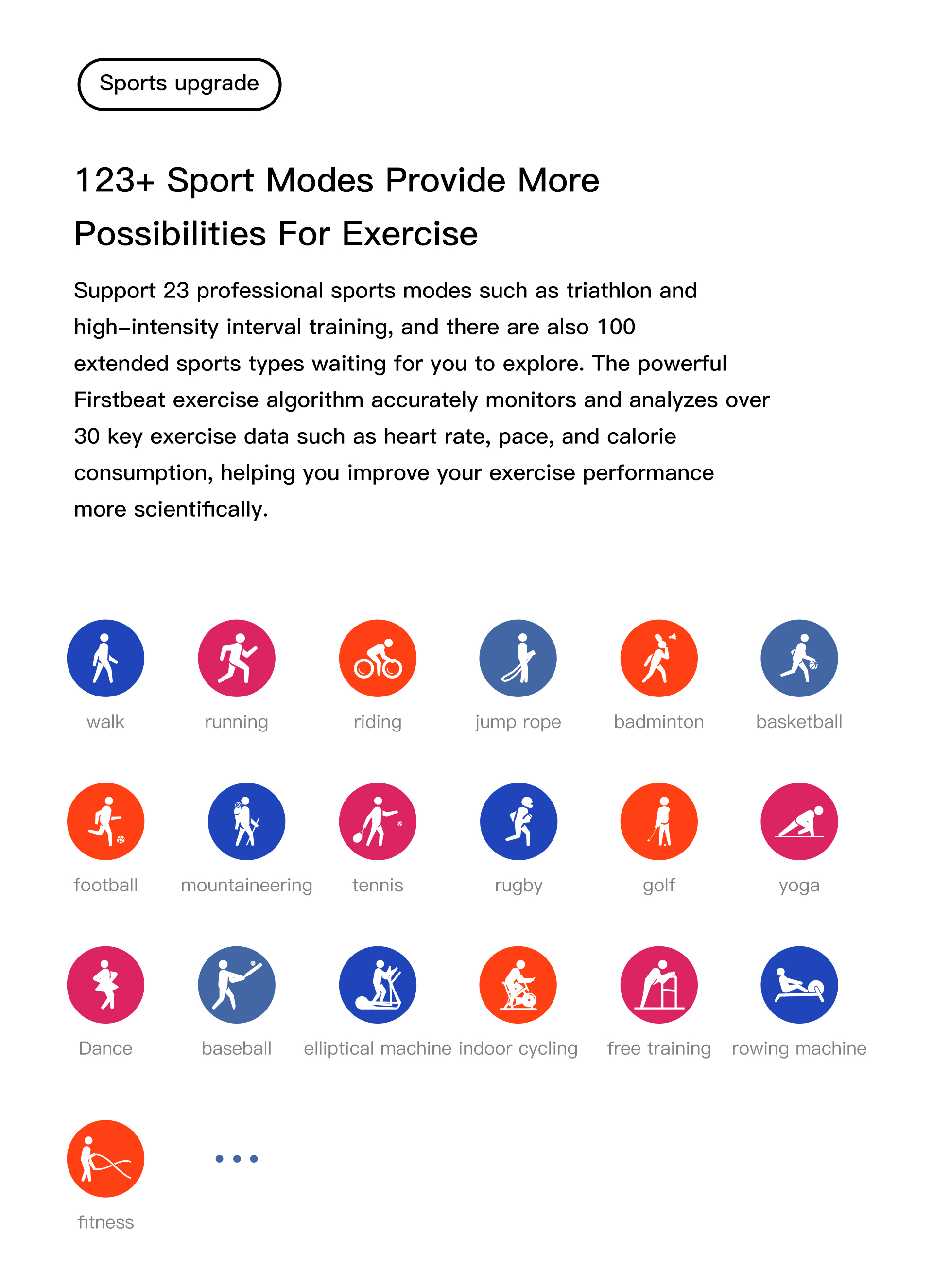 *100 Plus Sports Modes* The watch supports 123 sports modes such indoor running, walking, rope skipping, swimming, cycling mountaineering and other sports modes.Calculate your exercise time, calories burned, heart rate, etcto keep you motivated, or keep trying, and see how youare how you have performed recently.