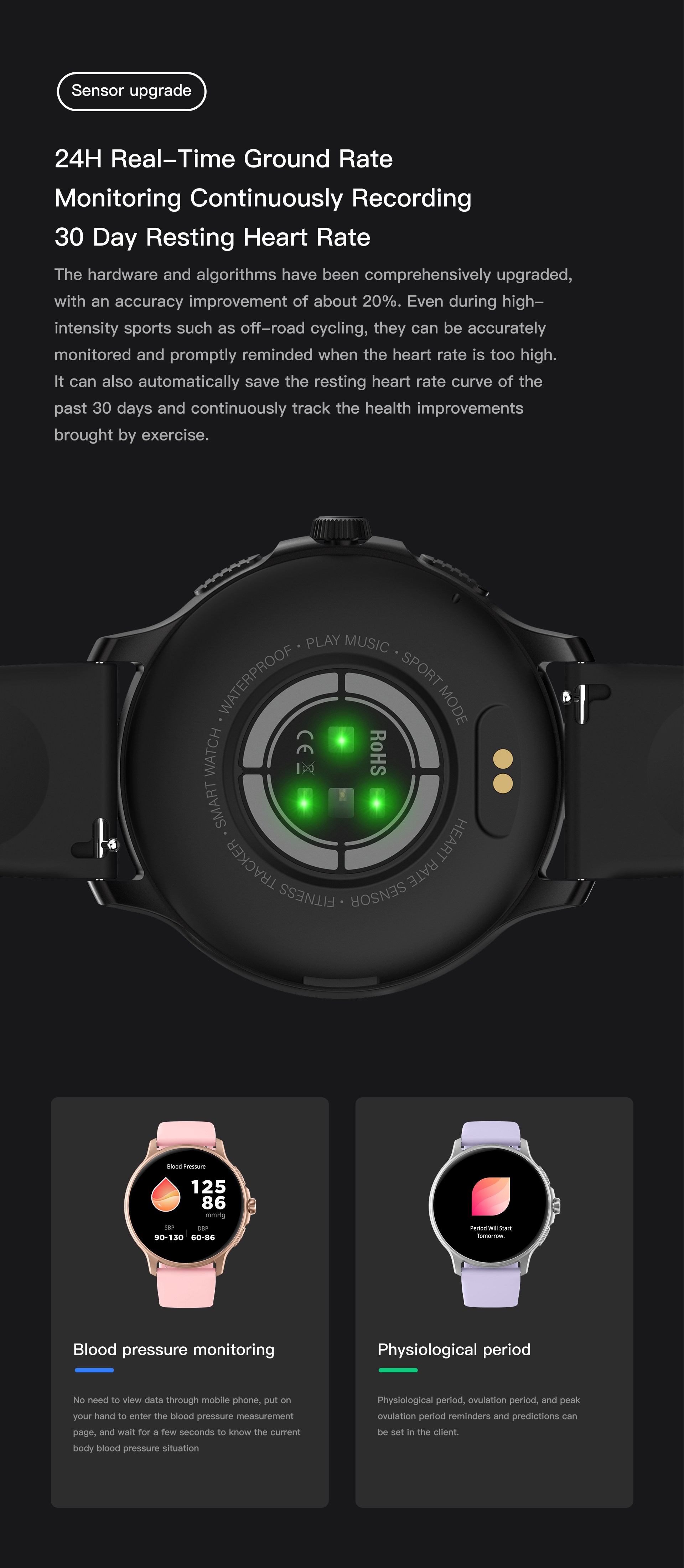 *24/7 Monitor Your Health* Adopts high performance heart rate sensor, automatically collects heart rate data every half hour collects heart rate data once every half hour and intelligently identifies abnormal heart rate. watch allows you to monitor and keep track of your body changes anytime, anywhere.